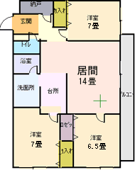 3LDK (居間14畳/台所2.5畳/洋室7畳/洋室7畳/洋室6.5畳/バルコニー) |